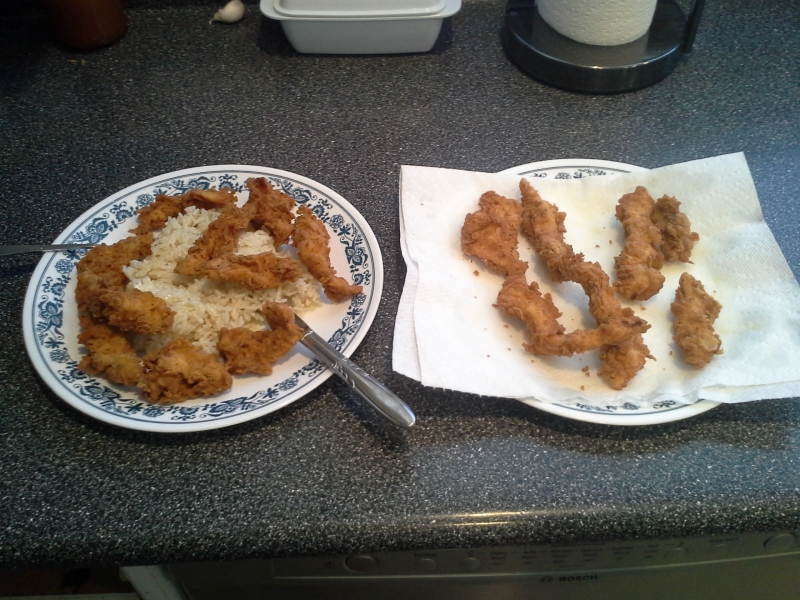 You’d probably pay $18 – $20 for a load of “Chicken Strips” from a takeout window that’s even close to this. I made this with one (1) chicken breast.