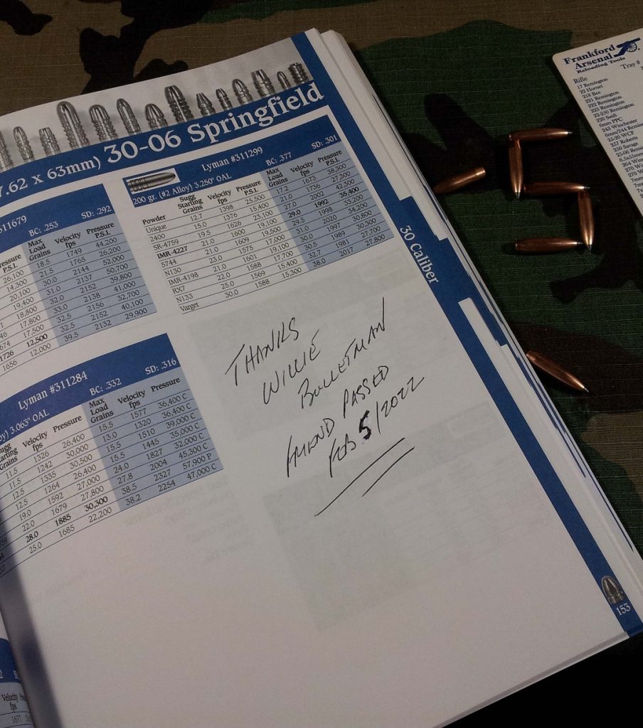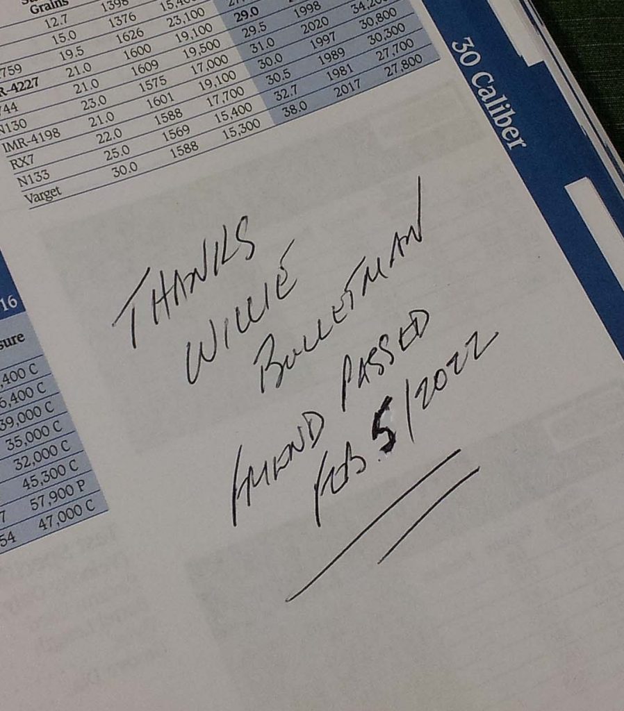 Friend, father, grandfather, husband, vet, generous, proud American. Glad I had a chance to know you! I’ve made an entry in my loading book just for you! A good old solid American caliber just for you. .30-06 Springfield.
