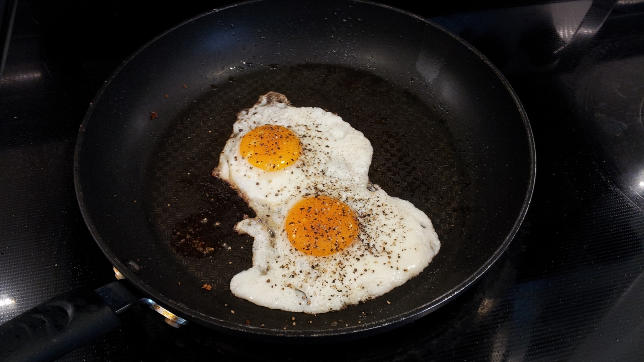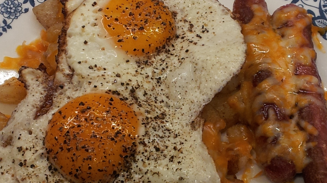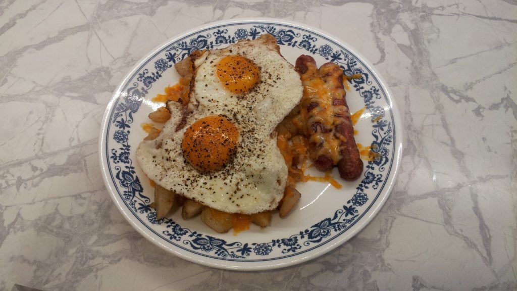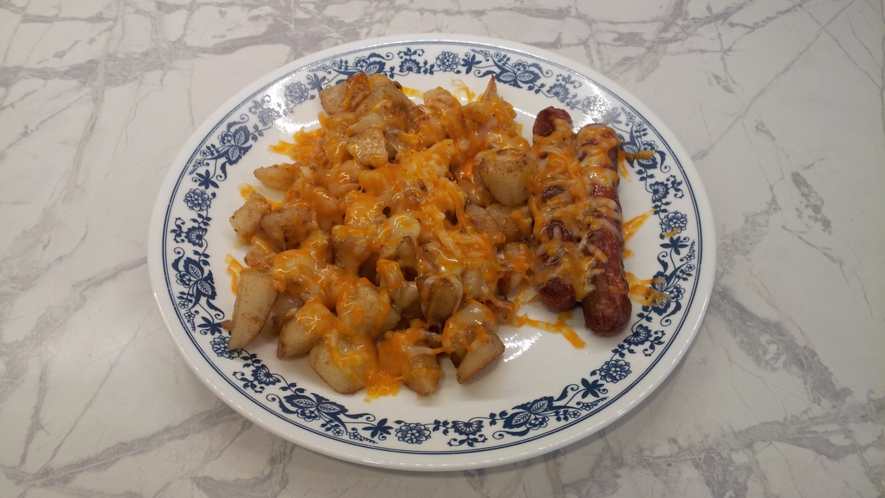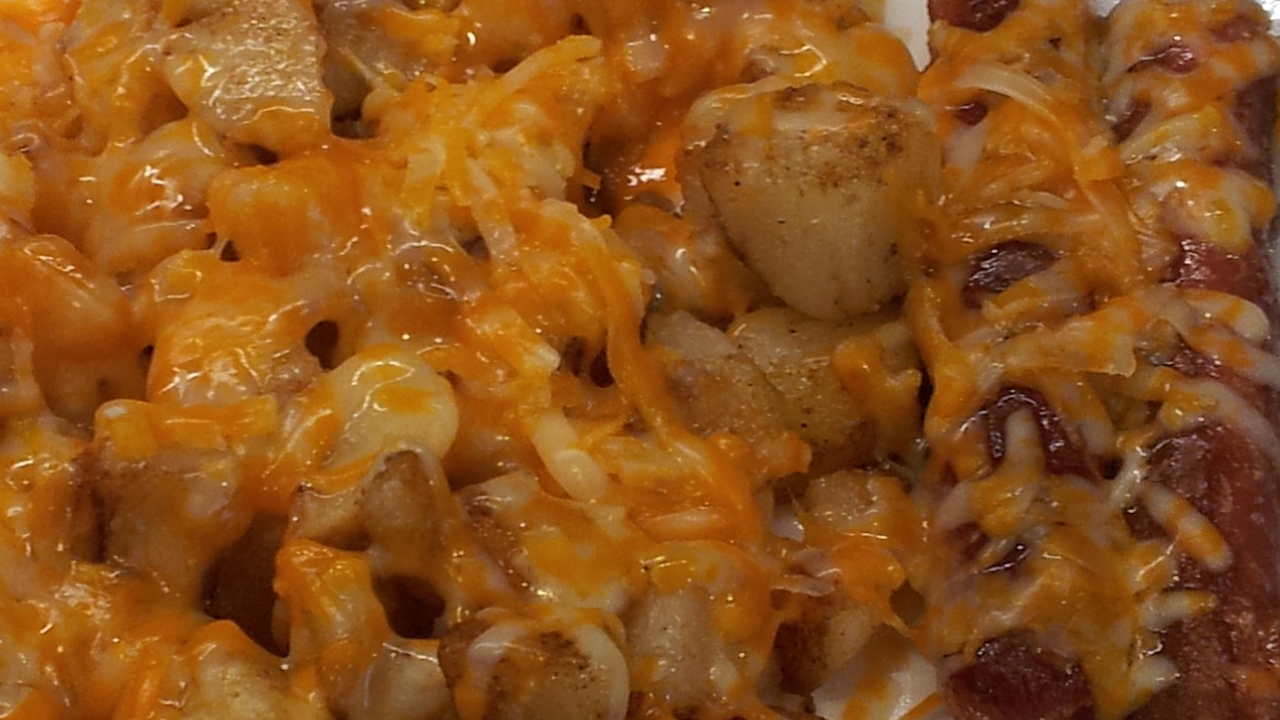 Leftover fried potatoes, 2 fried hotdogs, smothered in shredded cheese, topped off with 2 eggs. You can thank me later.