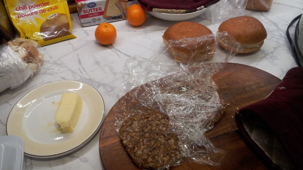 Fry up the previously made sausage patties and stack it all up! I used a slice of bread for the center section.