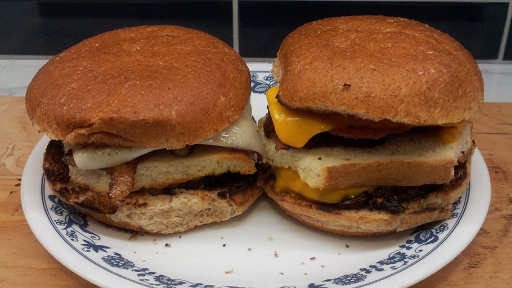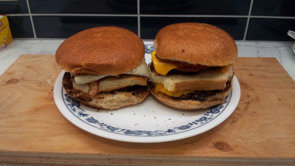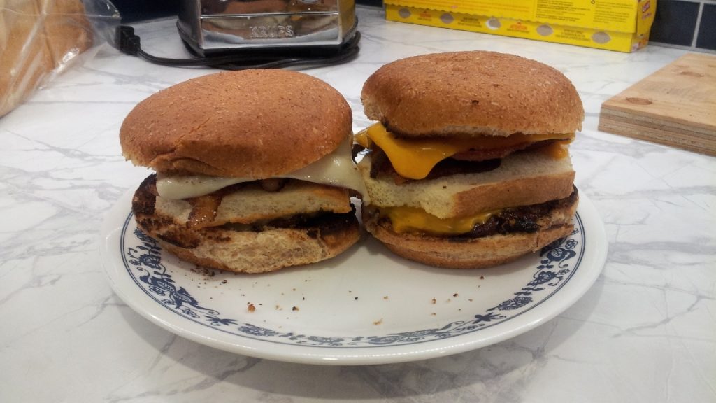 Listed from the bottom on up we have, Bun, Butter, Sausage, Bacon Fat Pieces, Cheese, Bread, Bacon, Cheese, Bun. One Mozza, one Cheddar!