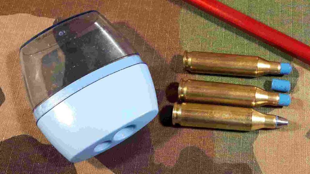 .243 just happened to fit into the pencil sharpener really well! I just shaved off about 8.2 gr. of lead, gave the pellets a nice spitzer point, then shot ’em!