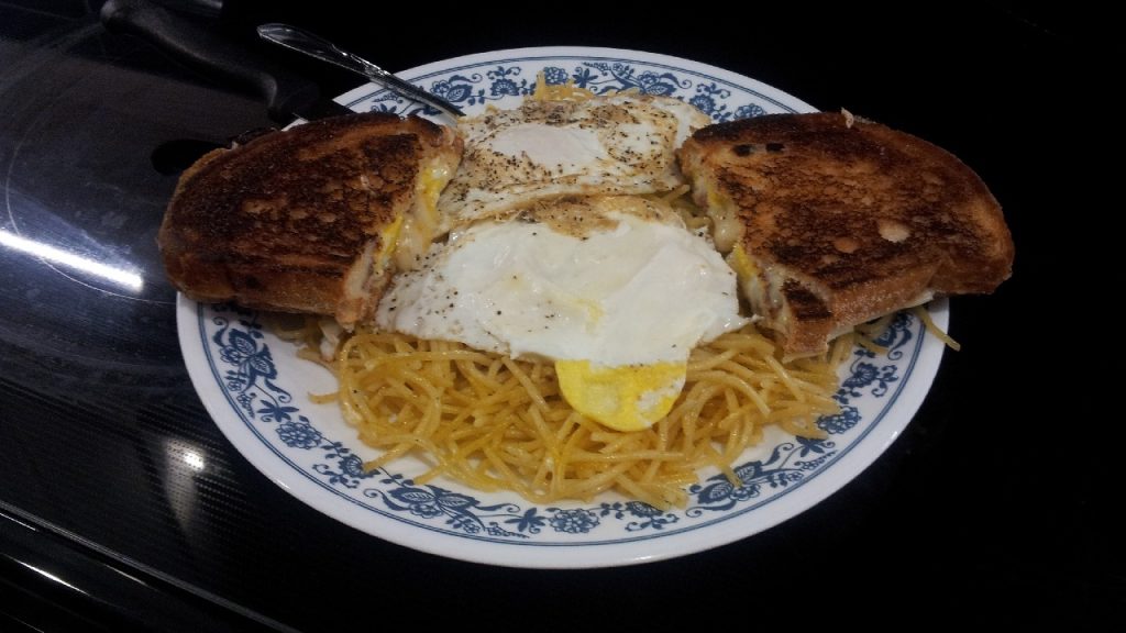 I’ll have some leftover spaghetti, fried, with 2 eggs, over easy & a triple bread grilled cheese with egg and hotdog slices, PLEASE. Thanks!