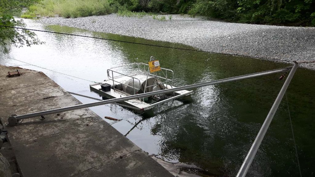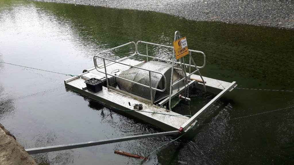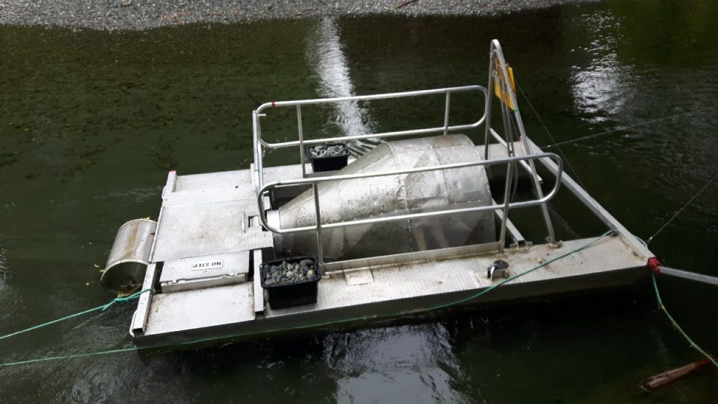 Rotary design, so it just turns slowly and fish get funneled into a catch bin. They tell me they are getting Chum Salmon, Coho Salmon and lots of Rainbow Trout. They might even catch Cutthroat Trout or Brown Trout because they are in the area as well, but they haven’t caught any of those yet.