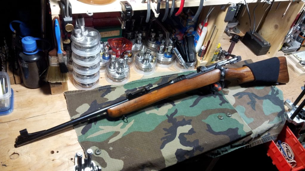 The stock is an original issue military, 2 piece stock that has been “Sporterized”.